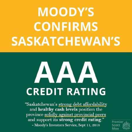 Premier Scott Moe, "Moody’s has just confirmed Saskatchewan has the highest possible credit rating from Moody’s Investors Service: Aaa. We remain on track with our three year plan to balance the budget. Moody’s Investors Service today confirmed Saskatchewan’s Aaa credit rating, the agency’s highest rating for Canadian provinces. “Moody’s Aaa rating for our province is a further demonstration that our government’s fiscal plan is on track,” Finance Minister Donna Harpauer said. “We’re heading in the right direction, reducing our deficit through careful management of our spending, keeping our economy strong and investing in priorities for Saskatchewan people. We’re focused on returning the budget to balance by 2019-20.” In its update report, Moody’s cites “very strong debt affordability, a health liquidity cushion and conservative fiscal and financial management practices.” Moody’s goes on to state that “Saskatchewan’s strong debt affordability and healthy cash levels position the province solidly against provincial peers and support its strong credit rating.” Saskatchewan and British Columbia are the only two provinces with Aaa ratings from Moody’s. Saskatchewan continues to have the second-highest overall credit rating among provinces, behind only BC, when the ratings of the three major agencies (Moody’s, Standard and Poor’s and Dominion Bond Rating Services) are considered.
