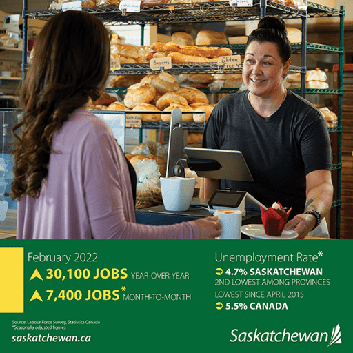 Today, job numbers released by Statistics Canada for February 2022 show Saskatchewan added 30,100 jobs, an increase of 5.6 per cent, compared to February 2021. Of these, 19,500 were full-time jobs. Month-to-month seasonally adjusted employment increased by 7,400, an increase of 1.3 per cent, the highest employment growth rate in Western Canada. Through the first two months of 2022, Saskatchewan had the second highest rate of job growth in Canada at 2.3 per cent.