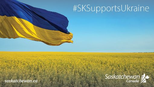 Saskatchewan's residents and businesses are encouraged to show their support for Ukraine by printing the attached poster and hanging it in visible locations. The hashtag #SKSupportsUkraine can also be used on social media.