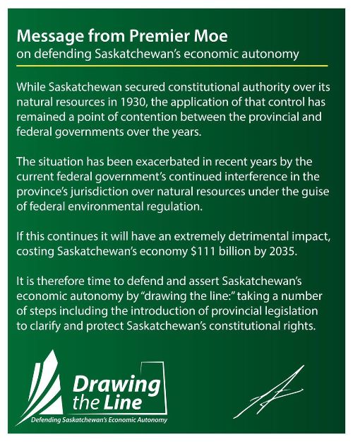 "The situation has been exacerbated in recent years by the current federal government's continued interference in the province's jurisdiction over natural resources under the guise of federal environmental regulation," Moe said. "It is time to defend and assert Saskatchewan's economic autonomy by 'drawing the line:' taking a number of steps including the introduction of provincial legislation to clarify and protect Saskatchewan's constitutional rights."