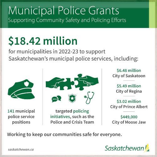 December 9, the Ministry of Corrections, Policing and Public Safety is providing $6.48 million to the City of Saskatoon through the Municipal Police Grants program in 2022-23. This grant will support 48 police service positions in the community.
