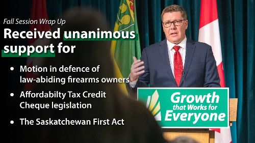 With the Fall sitting of the Legislature concluding today, the Government of Saskatchewan is highlighting the significant progress that has been made on priorities identified in the Throne Speech. Key initiatives this fall included providing affordability relief, investments in health care recruitment and retention, new initiatives to make communities safer and standing up for Saskatchewan's economic autonomy with the introduction of the Saskatchewan First Act.