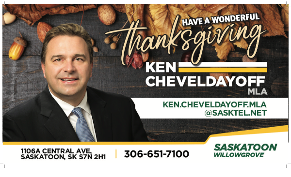 I hope this Thanksgiving finds you with plenty of reasons to be thankful. Enjoy family and friends and take a few moments to give thanks to everyone who has sacrificed to make our world a better place. Appreciation can change the moment, the day or even change a life! This is a special weekend to celebrate peace while reflecting on how fortunate we are to live in Saskatchewan.