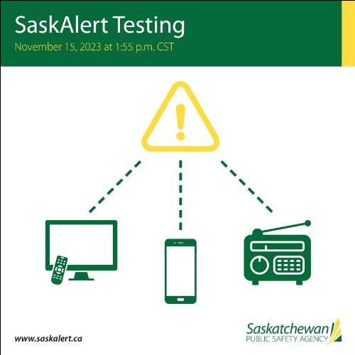 On Wednesday, November 15 at 1:55pm, there will be a testing of the SaskAlert system on radio, television and mobile devices across Saskatchewan.