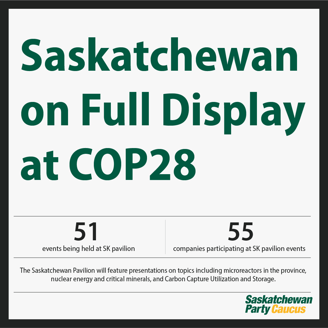 To maintain this momentum, Premier Scott Moe has led a delegation to the Council of Parties COP28 conference in Dubai. Joined by over 55 companies and organizations, the delegation is sharing Saskatchewan’s story on sustainability, innovations in environmental stewardship, and most importantly, how Saskatchewan has the food, fuel, fertilizer, and critical minerals to supply a growing world.