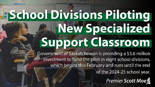 Saskatchewan school divisions will soon be piloting a new specialized support classroom focusing on helping staff manage and de-escalate behavioural incidents. The Government of Saskatchewan is providing a $3.6 million investment to fund the pilot in eight school divisions, which begins this February and runs until the end of the 2024-25 school year.