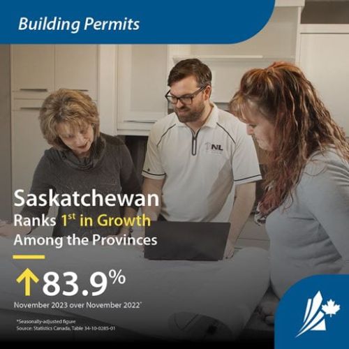 Statistics Canada is reporting significant growth in Saskatchewan's building permits. The total value of building permits in the province reached $249 million in November 2023 (seasonally adjusted). This is an 83.9 per cent increase from November 2022, and the highest increase in all of Canada. Saskatchewan also experienced notable month to month growth, showing an increase of 19.3 per cent compared to October 2023.