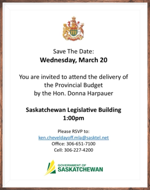 Please RSVP to ken.cheveldayoff.mla@sasktel as soon as possible.