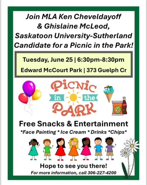 I look forward to seeing you on Tuesday at the Edward McCourt Park. I invite you to bring your family and friends for free snacks and entertainment!