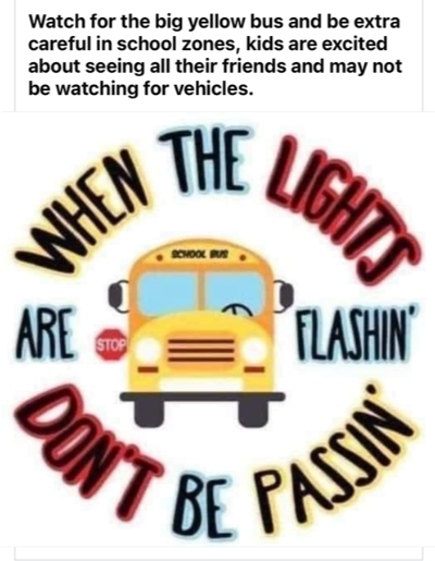Motorists, please be mindful of school zone speed limits and keep an eye out for students walking to and from school.