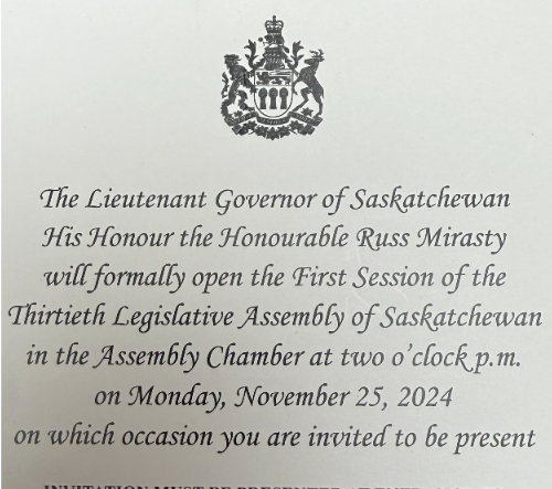 If you would like to attend the Speech from the Throne on Monday, November 25th, please contact my office by end of day Friday, November 22nd. I have a limited number of invitations, so please let us know today. You can contact our constituency office at 306,651.7100 or contact me directly by texting or calling 306,227,4200.