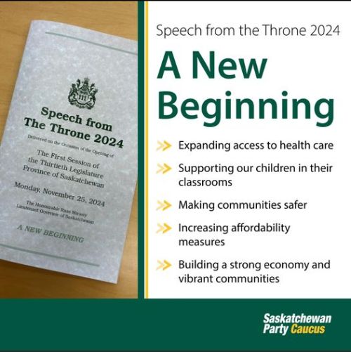 "The recent election and this Throne Speech mark a new beginning for our government," Moe said. "We will work to deliver on all the commitments we made in the election campaign and we will work to address those areas where voters told us we need to do better."