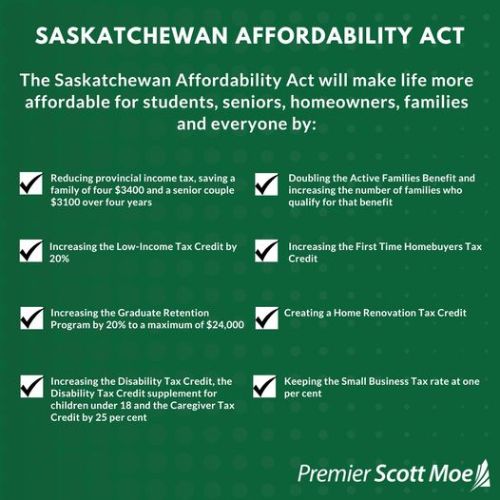 Following up its commitment in the recent provincial election, the government introduced The Saskatchewan Affordability Act in the Legislative Assembly today. The Act will enhance Saskatchewan's status as the most affordable place in Canada to live, work, raise a family and start a business by implementing 13 affordability commitments.