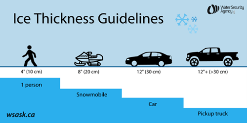 With colder temperatures arriving and ice beginning to form on our waterbodies across the province, Water Security Agency (WSA) is reminding the public about ice safety. Ice does not freeze at a uniform thickness and its strength can vary considerably from one area to another. The date that ice becomes safe at a particular site varies from year to year, requiring the verification of the thickness each year as opposed to relying on past experiences.