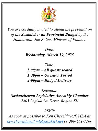 Our government looks forward to sharing the 2025-26 Budget on March 19th. If you would like to attend, please let our office know by noon Monday, March 17th. If you have any questions or comments, please reach out to my office at ken.cheveldayoff.mla@sasktel.net or call 306.651.7100..