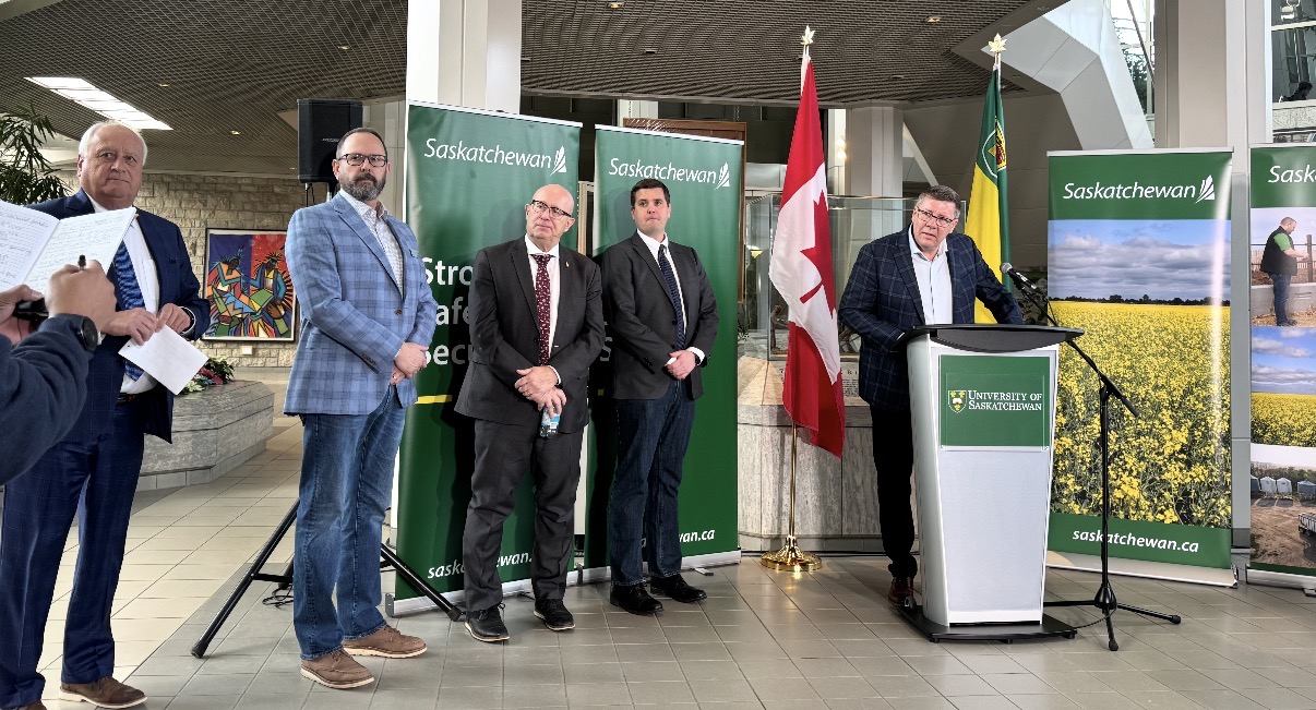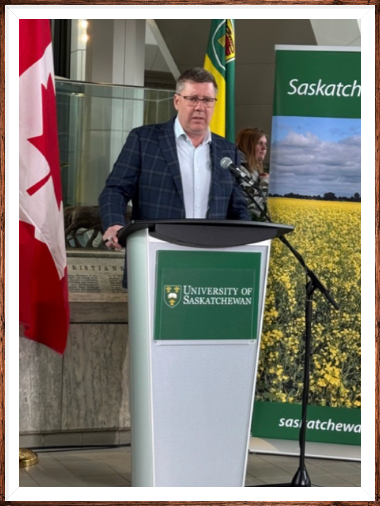 The news conference brought together a distinguished group of participants, including the Honourable David Marit, the Honourable Warren Kaeding, University of Saskatchewan President Vince Brunni Bossio, and agriculture leaders from across Saskatchewan and Canada. The event was held at the College of Agriculture building on the University of Saskatchewan campus in Saskatoon, underscoring the central role of agriculture and innovation in the province’s future.